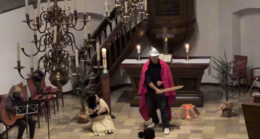 Nachdem Pfarrer Munkes alle begrüßt und ein gemeinsames Gebet gesprochen hatte, ritt St. Martin in die Kirche. Die Kinder verfolgten begeistert, wie einige Mitarbeitende des Familienzentrums die Martinsgeschichte als Theaterstück aufführten. Zwischen den einzelnen Szenen sangen die Kinder die verschiedenen Strophen des Martinliedes. Am Ende gab es viel Applaus für die Darstellerinnen und Darsteller!