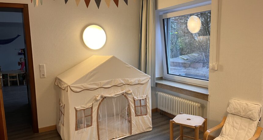 Ein besonderes Highlight ist das neue Snoozle-Zelt mit einer stimmungsvollen Lichterkette und passenden Kuschelkissen. Dieser Bereich lädt die Kinder zum Entspannen, Träumen und Zur-Ruhe-Kommen ein und unterstützt sie dabei, Momente der Geborgenheit im Kita-Alltag zu finden. Ergänzt wird der Raum durch einen neuen Teppich, der nicht nur für Wärme und Gemütlichkeit sorgt, sondern auch als angenehme Spielfläche dient.