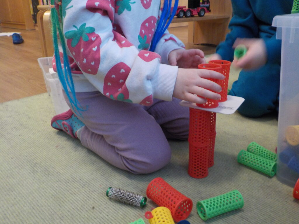 Zu Anfang waren die Kinder noch etwas ideenlos und fragten, was man damit denn bauen kann. Nach ein paar Tipps fingen die Kinder an, verschiedene Dinge entstehen zu lassen. So wurden aus den Lockenwicklern und Bierdeckeln Türme gebaut. Manche Kinder legten Bilder oder versuchten aus den Bierdeckeln Häuser zu stapeln. Einige Kinder entdeckten auch, dass man die verschieden großen Lockenwickler ineinander stecken kann oder sie zu einer Reihe verlängern kann.