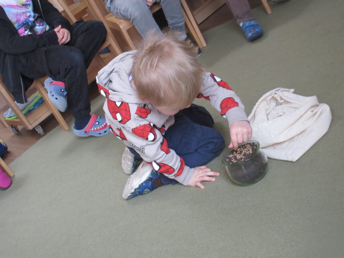Die Erzieherin hatte einen Beutel dabei, der etwas enthielt, das für die Geschichte wichtig ist. Die Kinder griffen nacheinander in den Beutel und versuchten zu ertasten, was sich wohl darin befand. Als alle getastet hatten, äußerten die Kinder Vermutungen: „Ich glaube, es sind kleine Steine“ oder auch „Ich denke, das sind Körner“.