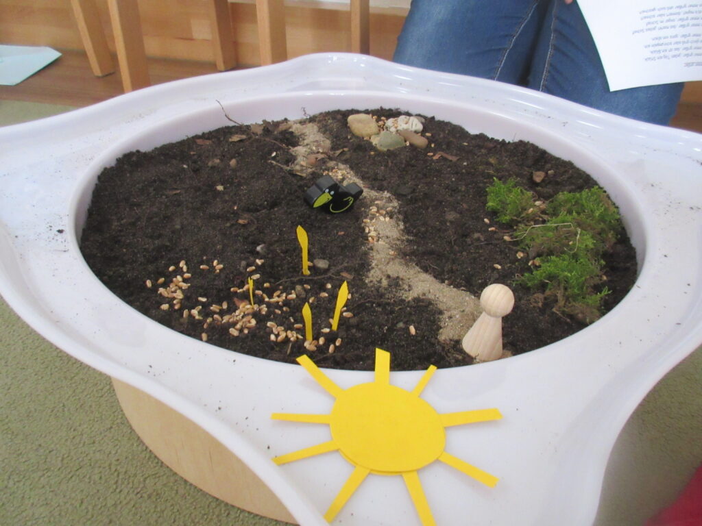 Dann wurde auch das Tuch der zweiten Szene hochgehoben, und die Kinder konnten eine Art Garten sehen, mit einem Weg, Steinen, Büschen und Erde. Gespannt lauschten die Kinder der Geschichte, als der Sämann losging und die Samen verstreute. Ein paar landeten auf dem Weg, wo der Rabe sie fraß. Wieder andere landeten auf den Steinen, wo sie kein Wasser bekamen, oder unter den Büschen, wo ihnen das Sonnenlicht fehlte. Am Ende fielen einige Samen schließlich auf fruchtbaren Boden. Die Kinder fanden durch den Dialog während der Geschichte heraus, was Pflanzen brauchen, um zu wachsen: Wasser, Licht und gute Erde.