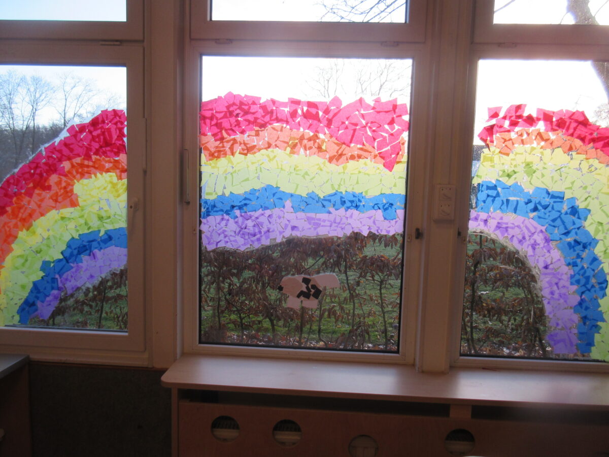 In einem Morgenkreis des evangelischen Familienzentrum Rönskenhof, Teil der evangelischen Kinderwelt Dinslaken, kam die Frage auf, wie die diesjährige Karnevalsdeko ausfallen könnte. In einem Punkt waren sich alle einig: möglichst BUNT soll sie sein. Die Kinder hatten vielerlei Vorschläge und letztlich haben sie entschieden, auf jeden Fall einen kunterbunten Regenbogen mit einer schwarz-weißen (Glücks-)Katze an die Fenster im Nebenraum zu bringen.