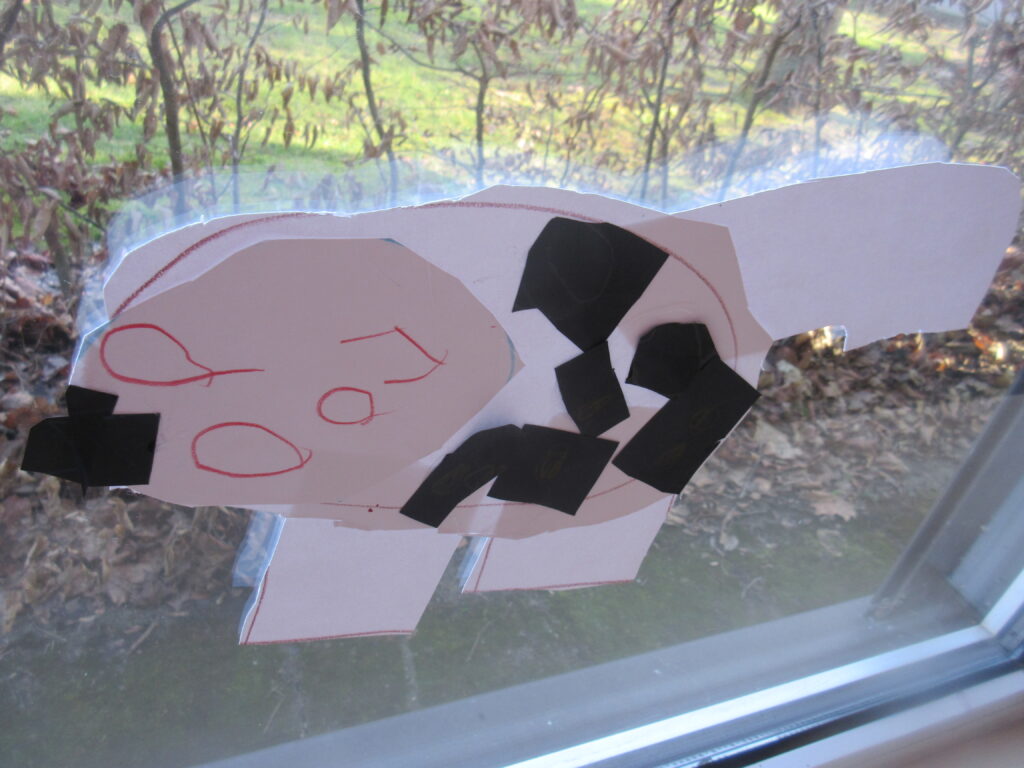 Zuerst hat ein Vorschulkind einen Plan dafür gemalt, an dem sich alle orientieren durften. Ein weiteres Kind lieferte die genaue Beschreibung der Katze: Sie sollte Punkte haben, aber auch einen weißen Bauch! Und dann haben sie sich ans Werk gemacht. Mit viel Eifer schnitten und rissen alle Kinder Transparentpapier. Als genug Schnipsel in den Schälchen lagen, wurden die Kittel angezogen und ein Fenster nach dem anderen mit Kleister und buntem Transparentpapier bestückt.