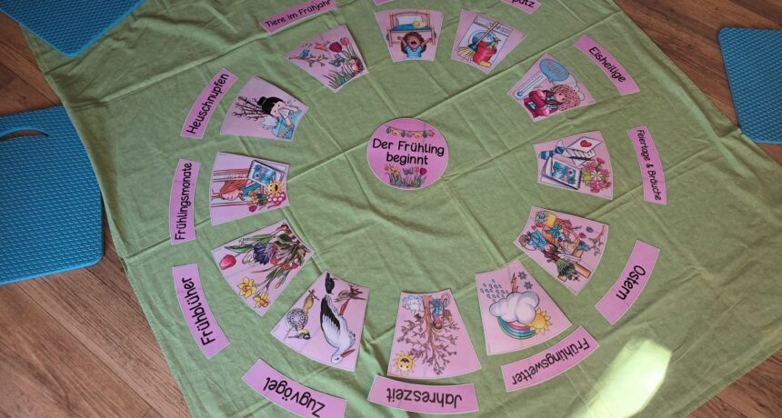 Auch die Kett-Methode wird bei uns praktisch umgesetzt. Dabei legen wir mit den Kindern Bodenbilder, wobei verschiedene Materialien verwendet werden, zB. Steine, Perlen, Holzscheiben, Korken, Tannenzapfen, Kastanien, Eicheln, Blätter oder Blumen.