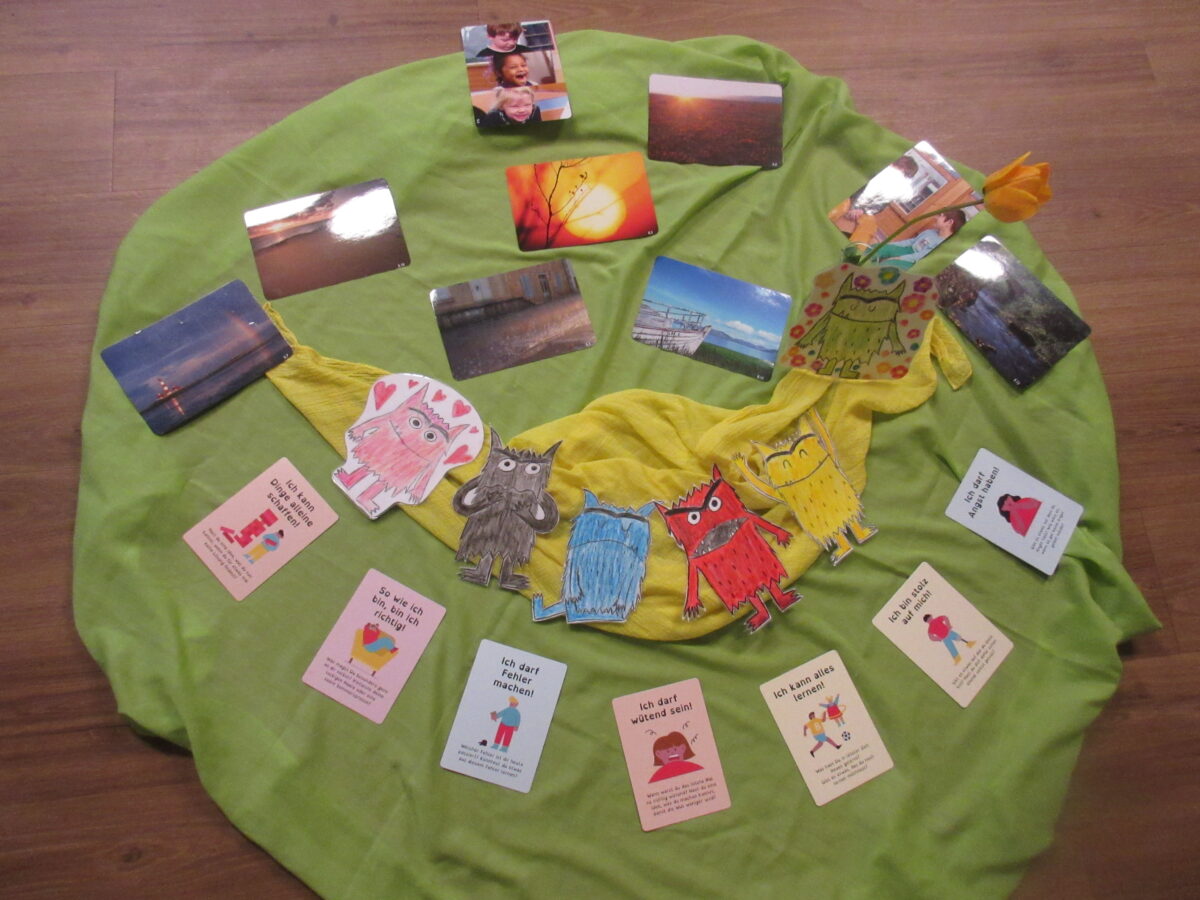 Darüber hinaus erhielten die Eltern Einblicke in Materialien, die im Kita-Alltag zur Unterstützung der sozial-emotionalen Entwicklung eingesetzt werden. Dazu gehörten unter anderem das „Farbenmonster“, das Kindern hilft, Gefühle zu benennen und zu ordnen, sowie Affirmationskarten, die das Selbstbewusstsein und die emotionale Stärke fördern.