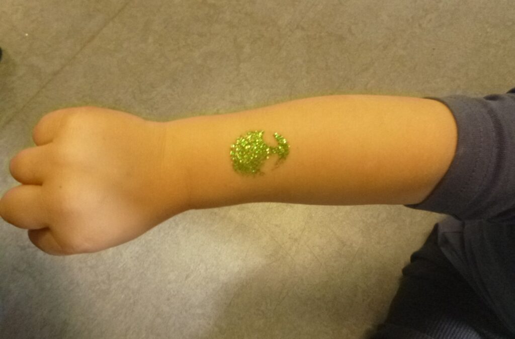Mit tollen Glitzertattoos konnten wir unsere Arme verzieren und ein kunterbuntes Kreuz für unseren Flur bemalen.